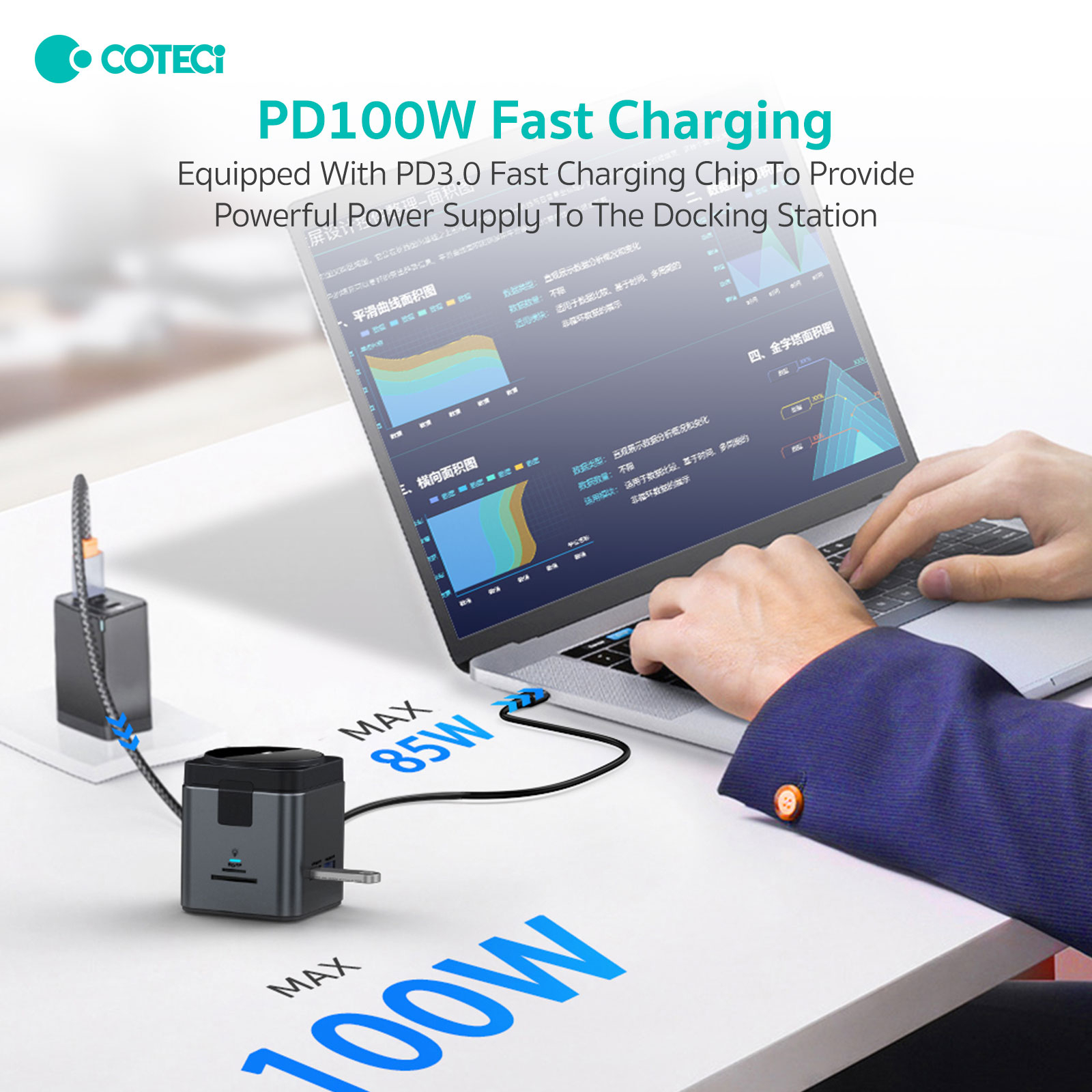 یکی از ویژگی‌های برجسته این داک، قابلیت شارژ سریع PD100W است که امکان شارژ دستگاه‌های مختلف را با سرعتی بالا فراهم می‌کند. به علاوه، این دستگاه از فناوری USB3 برای انتقال سریع فایل‌ها پشتیبانی می‌کند، که این امکان را به شما می‌دهد تا داده‌ها را با سرعت بالا جابه‌جا کنید و زمان را صرفه‌جویی نمایید.