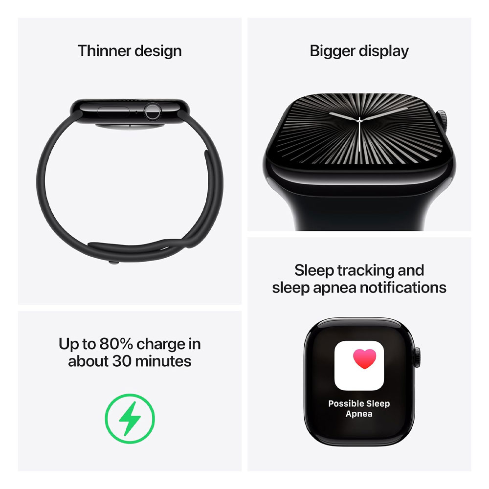 ساعت هوشمند اپل مدل Series 10 با ابعاد ۴۲x۳۶x۹.۷ میلیمتر و وزن ۲۹.۳ گرم، محصولی مناسب برای آقایان و بانوان است که هم در فعالیتهای روزمره و هم در موقعیتهای رسمی و ورزشی قابل استفاده است. جنس بدنه این ساعت از آلومینیوم بوده و در ساخت آن از شیشه Ion-X و سرامیک سافایر بهره گرفته شده است. صفحه نمایش ۱.۷۷ اینچی آن از نوع Retina LTPO3 OLED با وضوح ۳۷۴x۴۴۶ پیکسل و تراکم ۳۳۰ پیکسل بر اینچ بوده که قابلیت روشنایی بین 1 تا 2000 نیت را دارد. این ساعت با سیستم عامل WatchOS نسخه 11 و پردازنده Apple S10 عرضه شده و از فناوریهای مکانیابی GPS، A-GPS، GLONASS، GALILEO، BDS و QZSS پشتیبانی میکند.