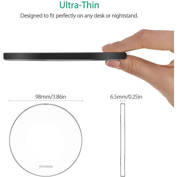 (طراحی باریک و جذاب): طراحی سبک، براق و جمعوجور با لاستیک ضد لغزش. این پد شارژ بیسیم تنها ۰.۲۳ اینچ فوقالعاده باریک است و فضای بسیار کمی را اشغال میکند و باعث میشود راحتتر در جیب جا شود. این پد شارژ بیسیم پرسرعت را میتوان به راحتی در طول سفر یا سفرهای کاری حمل کرد. این شارژر چه در دفتر کار و چه در خانه استفاده کنید، محکم و عالی به نظر میرسد.
