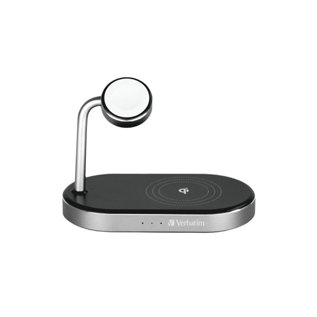 شارژر بیسیم ورباتیم مدل WCS-02 یک پایه شارژ ۳ در ۱ است که امکان شارژ همزمان سه دستگاه را فراهم میکند: یک گوشی هوشمند یا هدفون بیسیم از طریق پد شارژ بیسیم Qi، یک ساعت هوشمند اپل (Apple Watch) از طریق ماژول مغناطیسی داخلی، و یک دستگاه دیگر از طریق پورت USB-A با فناوری Quick Charge 3.0. این شارژر با توان خروجی کلی ۴۴ وات، توانایی شارژ سریع دستگاهها را دارد: تا ۱۵ وات برای شارژ بیسیم، ۵ وات برای Apple Watch، و ۲۴ وات برای پورت USB-A.