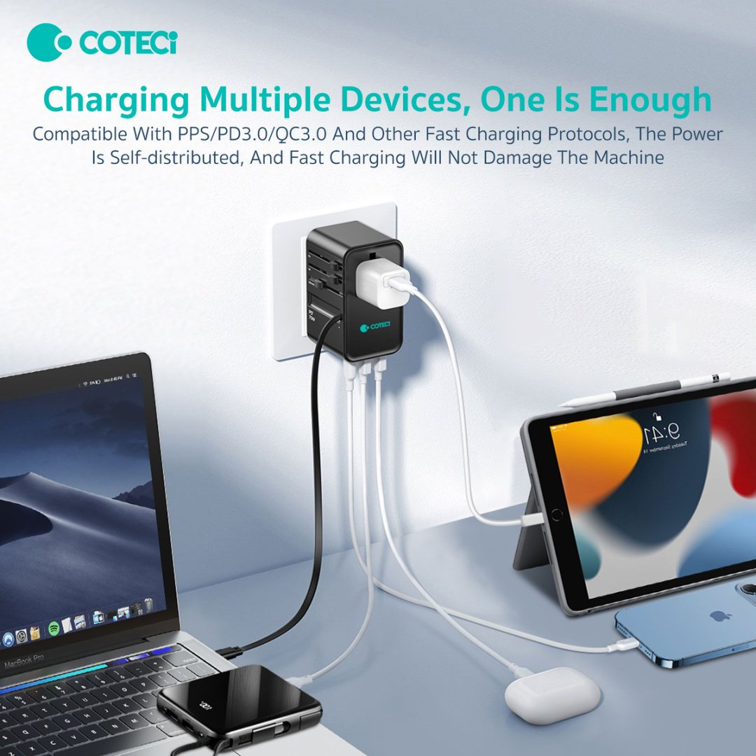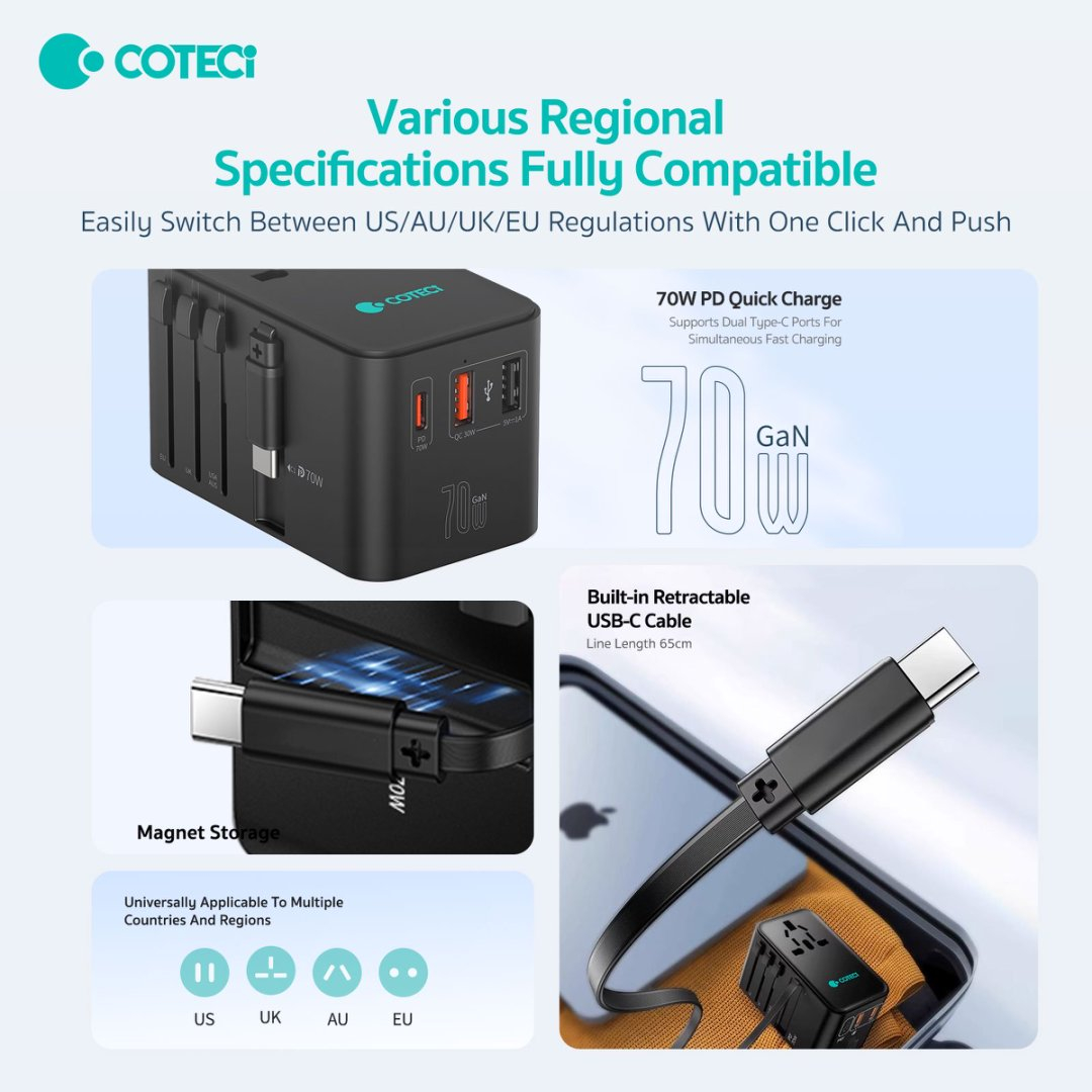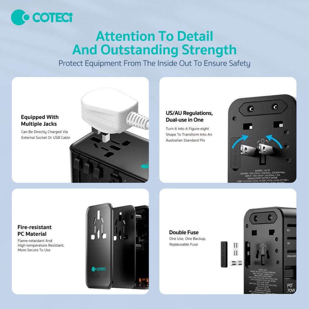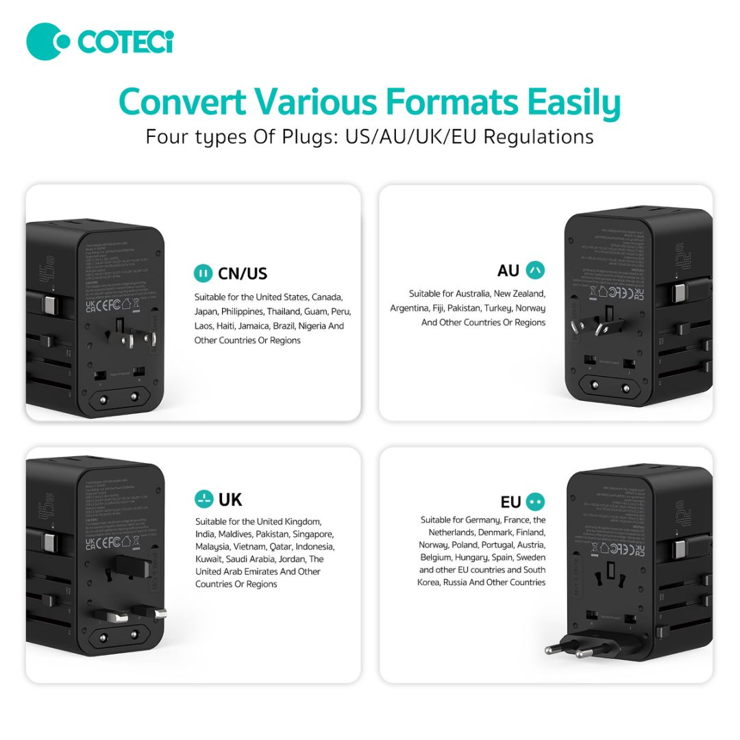 این شارژر با چهار نوع پریز مختلف (US/AU/UK/EU) طراحی شده است که آن را برای مسافرتهای بینالمللی بسیار کاربردی میسازد. با قابلیت سوئیچ آسان بین تنظیمات فقط با یک کلیک، شما میتوانید به راحتی از این شارژر در هر کشوری استفاده کنید و دیگر نیازی به نگرانی در مورد سازگاری با پریزها نخواهید داشت.