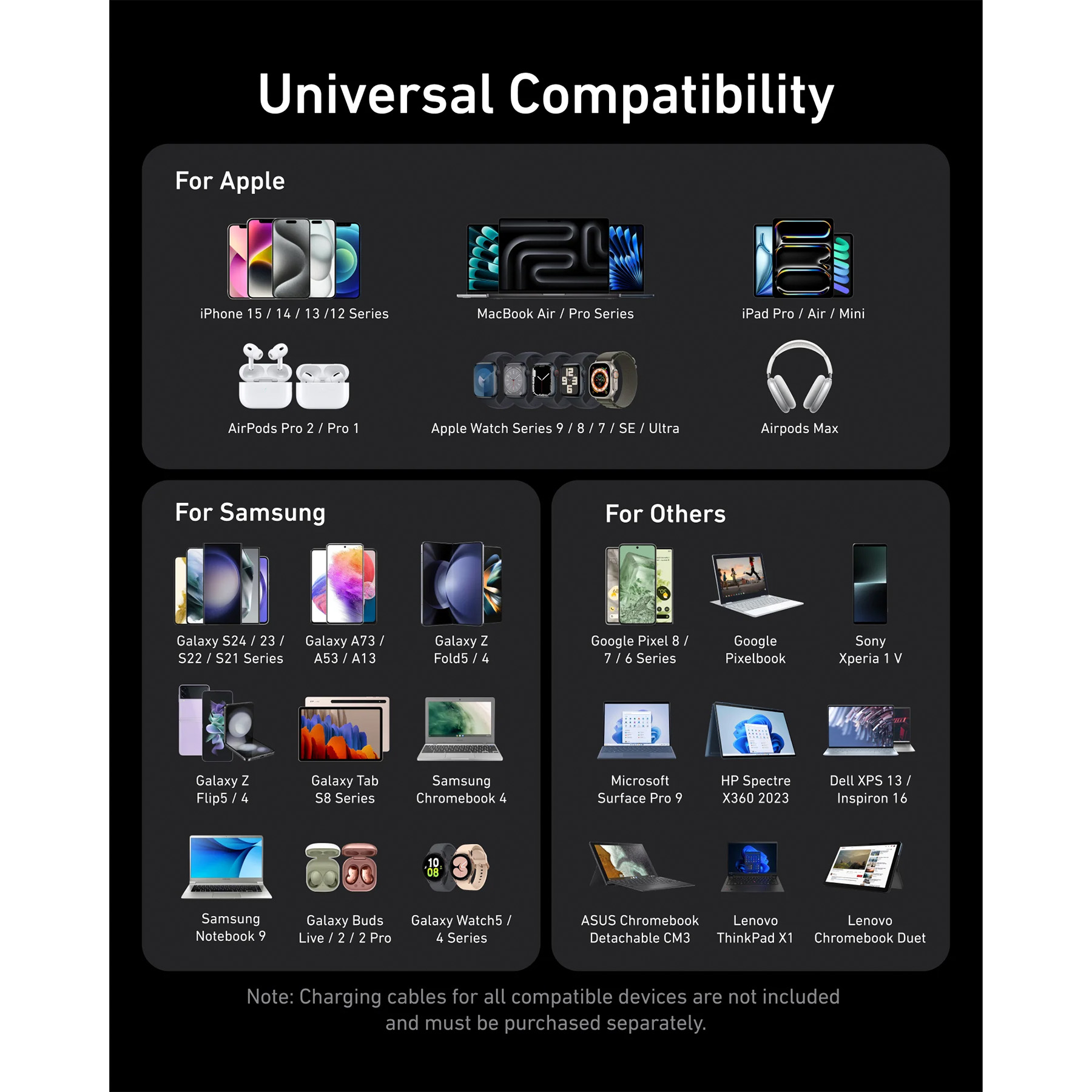 - توضیحاتدارای قابلیت شارژ سریع تا 200 وات، مناسب برای دستگاههای مختلف/ شارژ همزمان/ دارای سیستم محافظت از نوسانات برق/ امکان استفاده از کابلهای E-Marker برای خروجی 100 وات/ دستگاههای سازگار: سری iPhone 16/15/14، MacBook Air/Pro، iPad Pro/Air/Mini، AirPods Pro 2، Apple Watch، Galaxy S24/S23/S22/S21، Galaxy A73/A53/A13، Galaxy Z Flip 5/4، Galaxy Z Fold 5/4، Galaxy Tab S8، Samsung Chromebook 4، Samsung Notebook 9، Google Pixel 8 و سریهای دیگر، Microsoft Surface Pro 9، HP Spectre X360 2023، Dell XPS 13، Dell Inspiron 16، ASUS Chromebook Detachable CM3، Lenovo ThinkPad X1 و Chromebook Duet./ مدلهای گوشی سازگار: Galaxy S24/S23/S22/S21، Galaxy A73/A53/A13، iPhone / شارژ 6 دستگاه همزمان / شارژ سریع / پورت USB-C تا 100 وات / سیستم MultiProtect/ ActiveShield 3.0