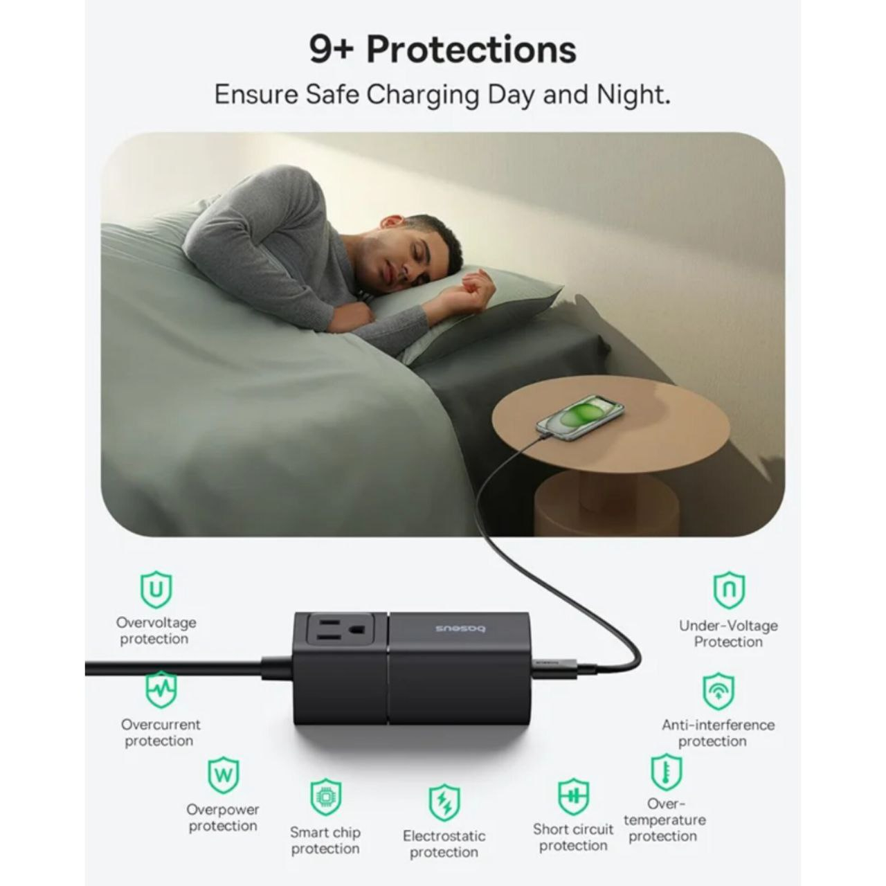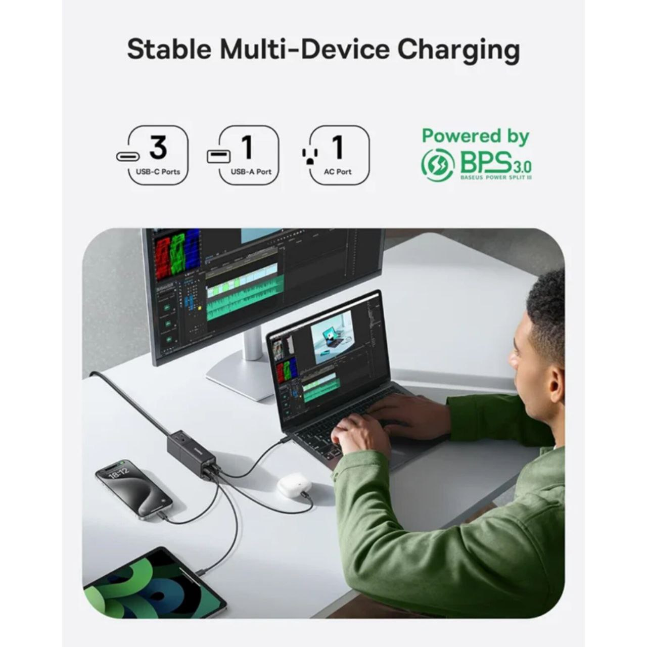 سازگار گسترده با دستگاههای مختلف: شارژر بیسوس میتواند دستگاه های مختلف از جمله لپتاپ، تلفنهای هوشمند، تبلت، هدفون و غیره را به سرعت شارژ کند. پریزهای برق متناوب همچنین با وسایل برقی مانند مینی پروژکتور، مانیتور، چاپگر، لامپ و غیره سازگار هستند.