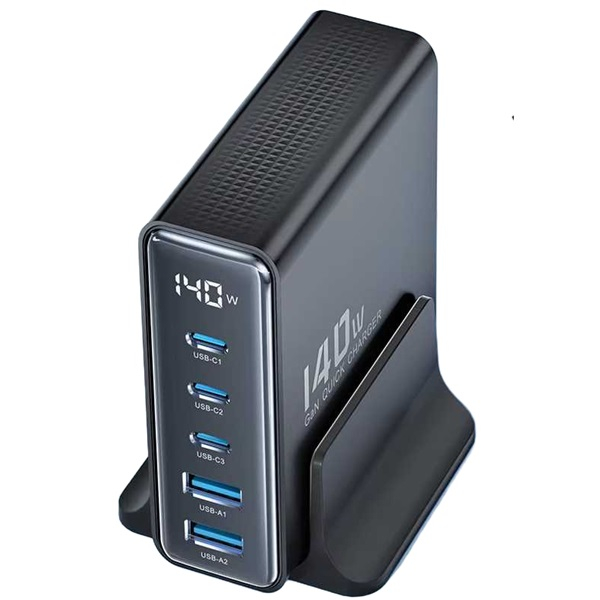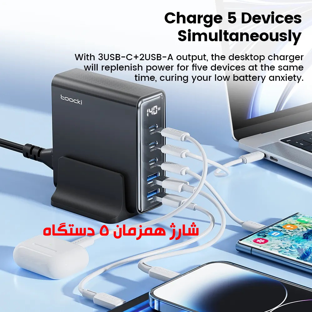 یکی از محصولات بسیار کاربردی شرکت صاحب نام توکی، شارژر رومیزی فوق سریع 140 واتی مدل TCT140-22 است. این دستگاه با داشتن 5 درگاه ( سه درگاه USB-C و دو درگاه USB-A) و توان کلی 140 وات توانسته نیاز کاربران را برای شارژ همزمان بسیاری از تجهیزات دیجیتالی از برندهای مختلف را با اشغال کمترین فضا بر روی میز کار برآورده نماید. بدنه این شارژر از جنس پلی کربنات ساخته شده است که این شارژر را در برابر حریق و حرارت بالا بسیار مقاوم نموده است. این شارژر با طراحی بی نظیر برای تمامی کاربرانی که از چند محصول به صورت همزمان بر روی میز کار خود استفاده مینمایند، توصیه میشود. این شارژر که دارای پلاگین استاندارد برای اتصال به پریز برق مدل EU است، به وسیله یک کابل 1.5 متری به برق شهر متصل میشود. در ساخت این شارژر از فناوری GaN بهره گرفته شده و همچنین از پرتکلهای شارژ سریع PD و QC نیز پشتیبانی میکند. با بهرهگیری از تراشه هوشمند، این شارژر دارای حفاظت چندگانه می باشد که از رسیدن آسیبهایی مانند جریان بیش از حد، ولتاژ بالا، اتصال کوتاه، دمای بالا و …، به دستگاهها جلوگیری میکند. پایه مخصوص قرارگیری شارژر بر روی میز، دیگر امکانی است که نه تنها موجب قرارگیری مناسب شارژر بر روی میز میشود، بلکه زیبایی خاصی به آن بخشیده است. همچنین صفحه نمایشکر تعبیه شده در این شارژ امکان اطلاع از وضعیت شارژ را به صورت بلادرنگ برای کاربر فراهم کرده است.