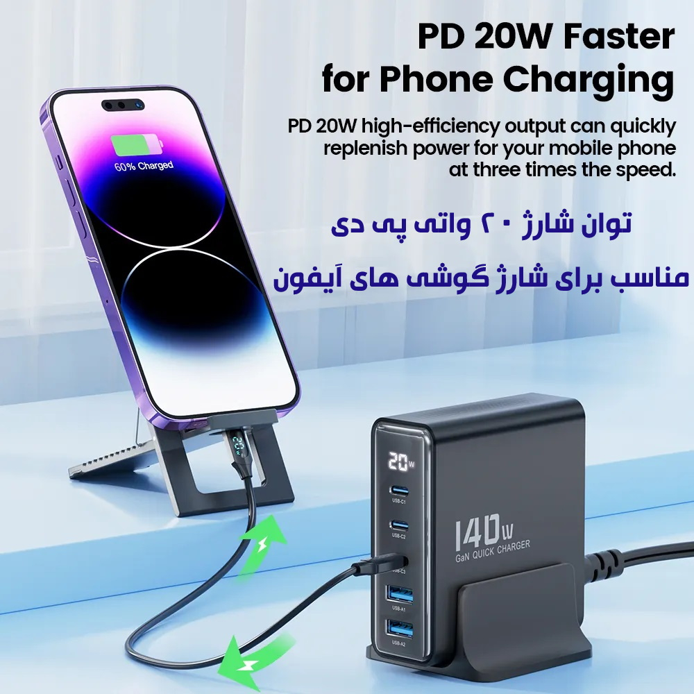 - توضیحاتدارای 3 عدد خروجی تایپ سی و 2 عدد خروجی USB A، دارای پایه برای استفاده در حالت ایستاده همراه یک عدد کابل به طول 1.5 متر، مجهز به فناوری شارژ سریع PD و QC و همچنین نمایشگر
