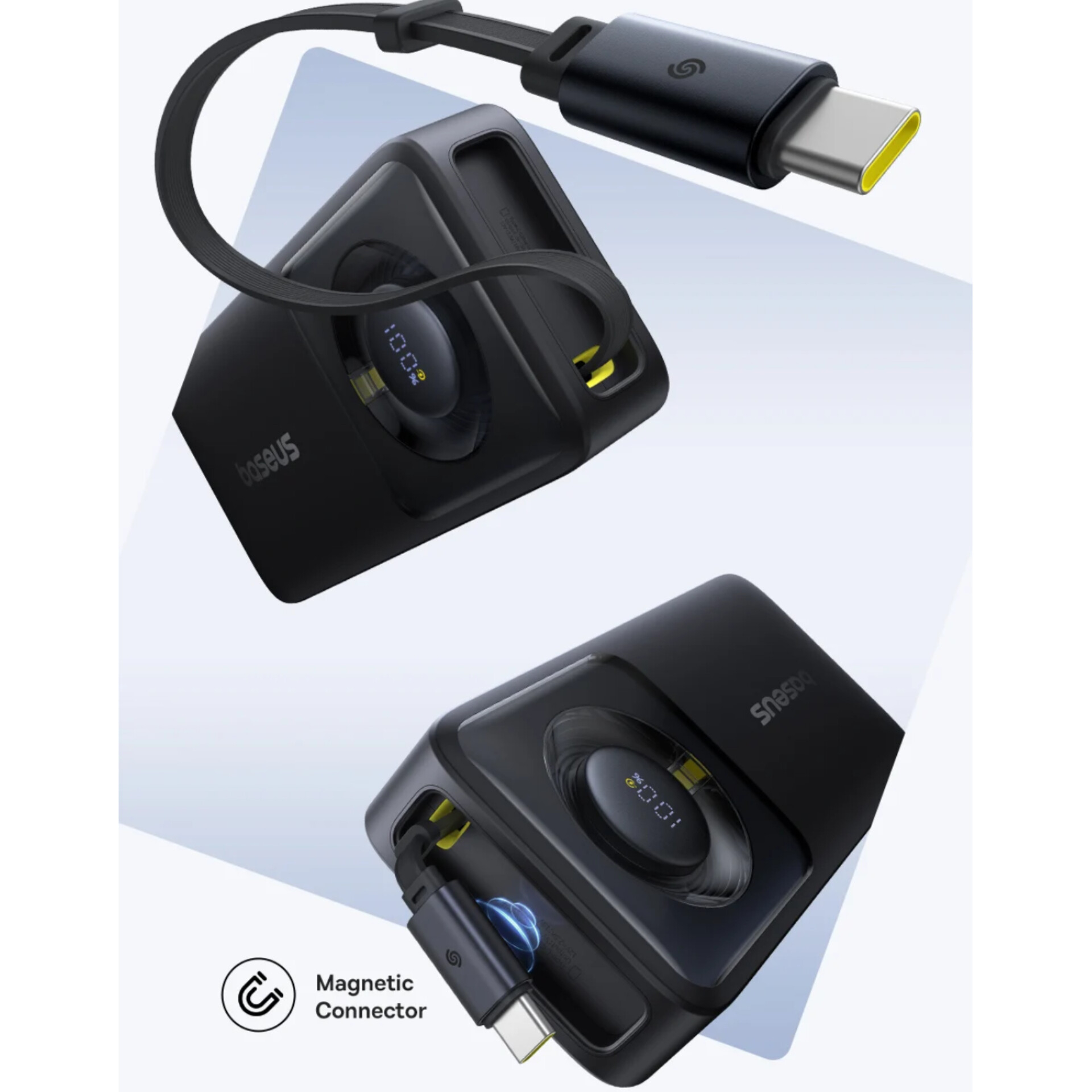 بدنه شارژر پرتابل بیسوس با استفاده از متریال مقاوم در برابر حرارت مانند پلاستیک ABS و پلی کربنات نسوز طراحی شده است، که امنیت بالایی در برابر افزایش دما فراهم می‌آورد. این محصول به یک صفحه نمایش دیجیتالی مجهز است که به صورت لحظه‌ای اطلاعات مربوط به میزان شارژ باقیمانده را نمایش می‌دهد. در قسمت بالای دستگاه، یک کابل تایپ‌سی جمع شونده با طول 70 سانتی‌متر و کانکتور مغناطیسی قرار دارد که به راحتی به بدنه پاوربانک متصل می‌شود و از انعطاف‌پذیری بالایی برخوردار است. با ابعاد 155×72×34 میلی‌متر و وزن 433.5 گرم، این شارژر به سادگی در دست، جیب یا کیف جای می‌گیرد و طراحی آن به گونه‌ای است که فضای کمی را اشغال می‌کند و به راحتی در کنار دیگر وسایل قرار می‌گیرد.