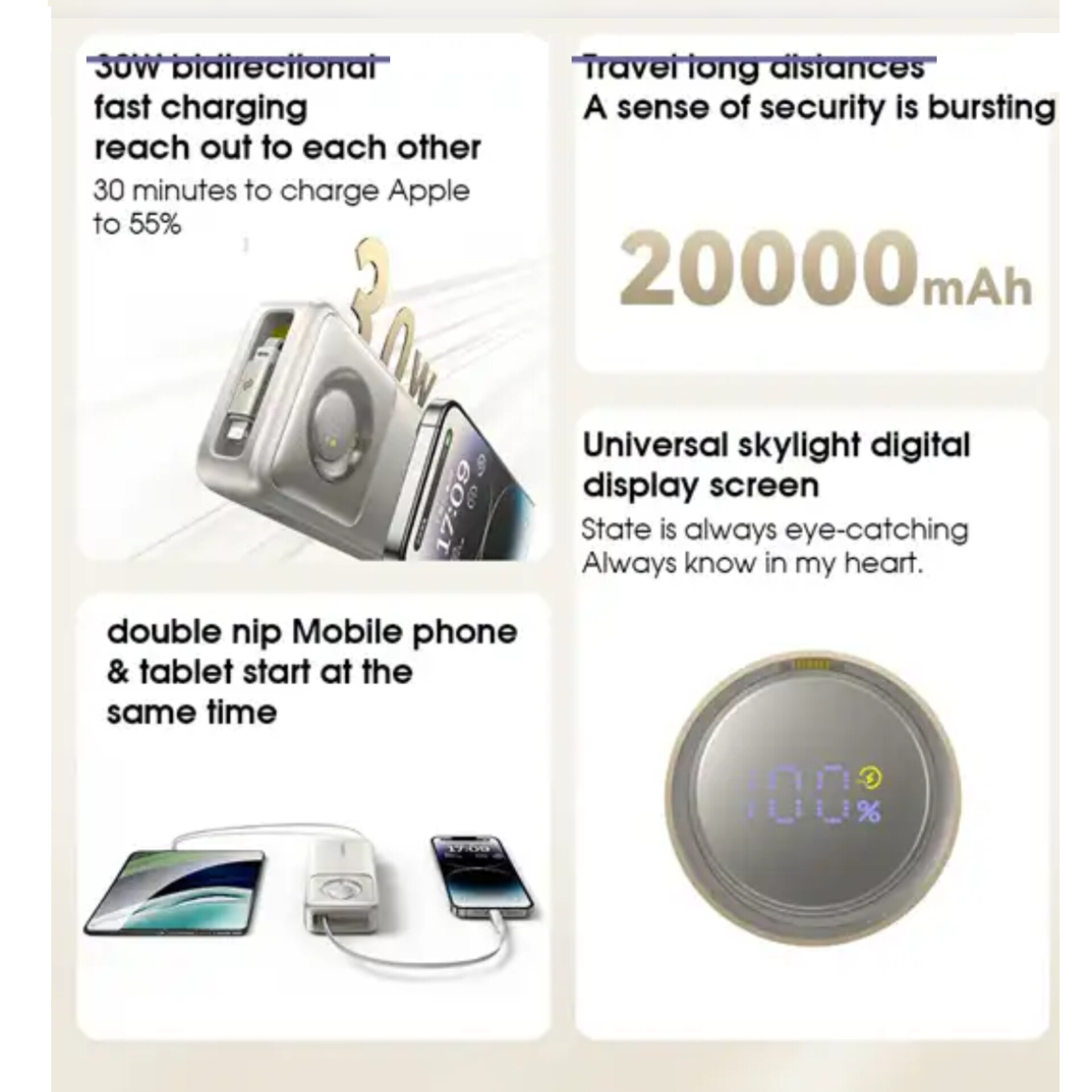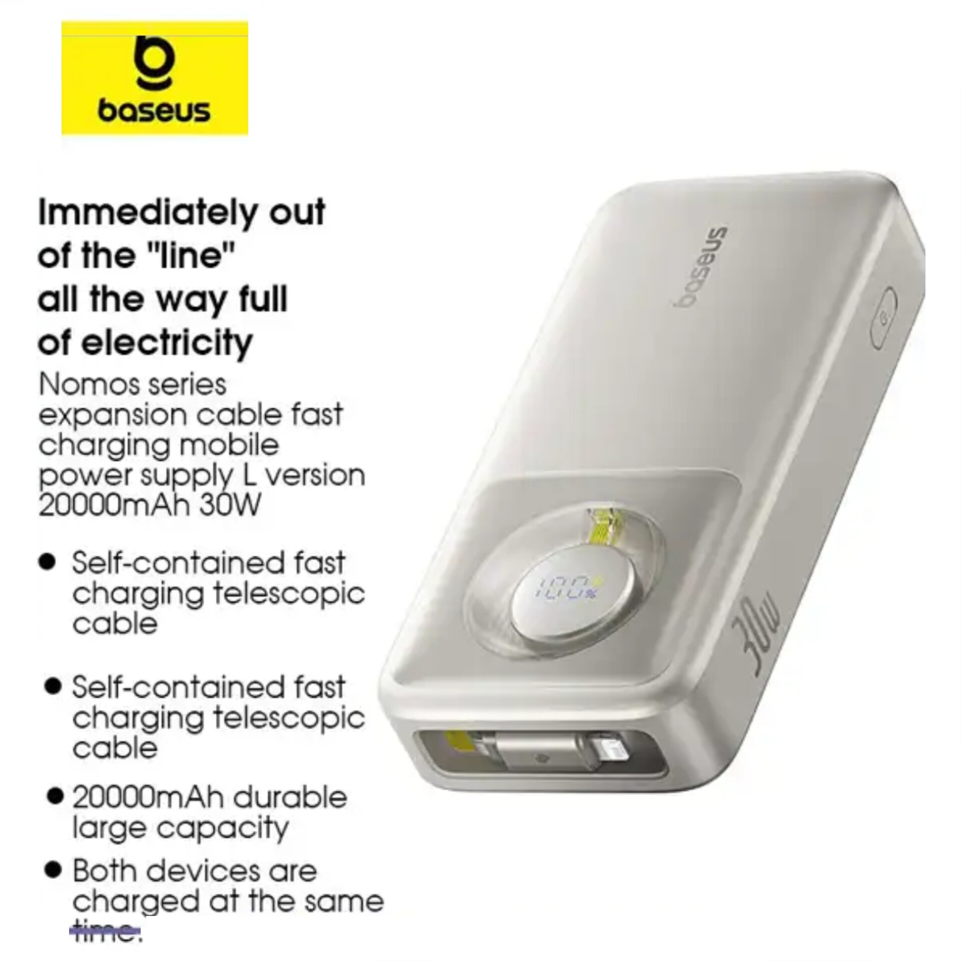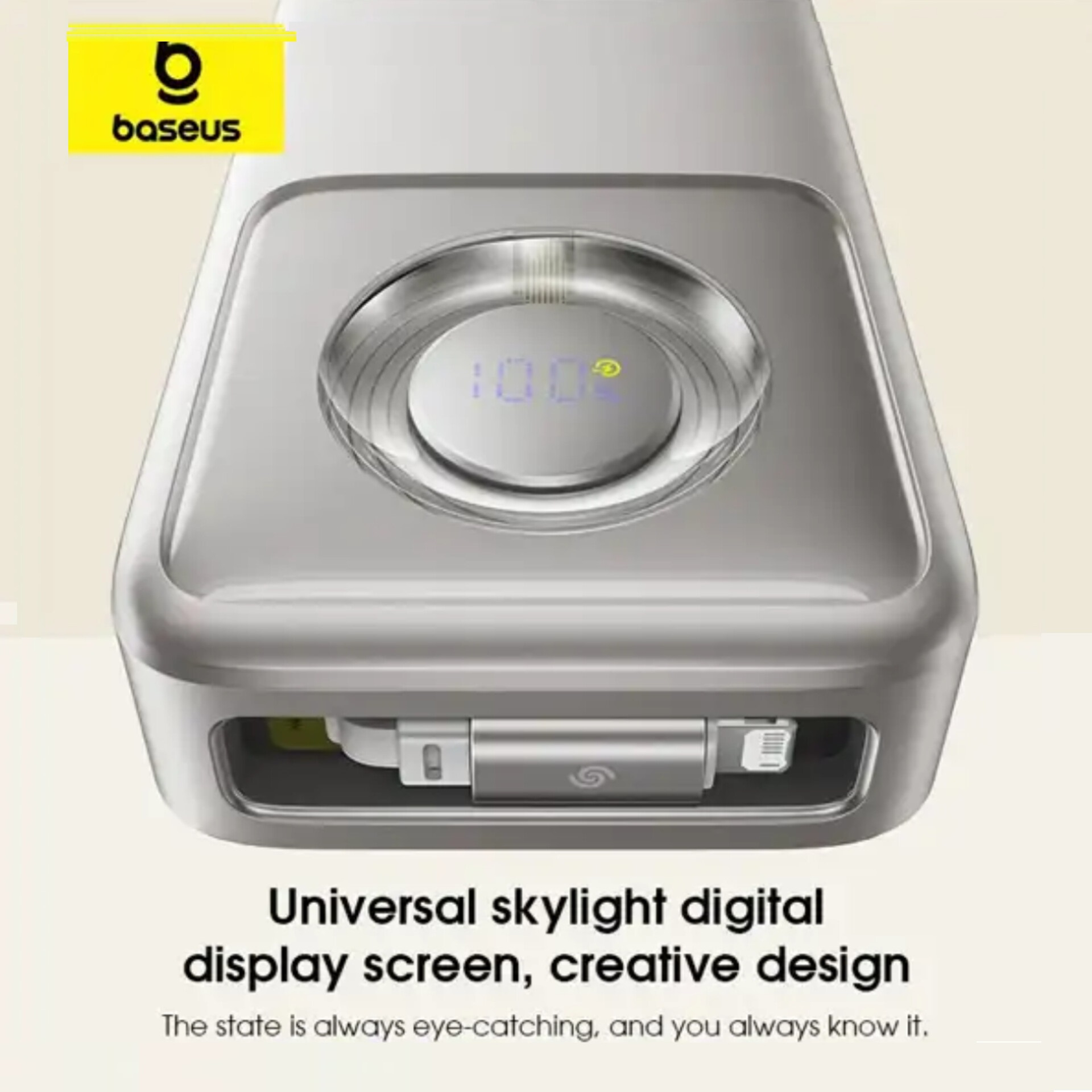 شارژر همراه 20000 میلی آمپر ساعت بیسوس با کابل لایتنینگ متصل به رنگ مشکی و رنگ تیتانیومی تولیده شده است. با پیشرفت تکنولوژی در سالهای اخیر و به کارگیری گوشیهای هوشمند در اکثر زمینهها نیاز به تامین انرژی گوشیهای هوشمند و سایر لوازم الکتریکی، یکی از مسائل مهمی است که اکثر کاربران با آن در گیر هستند. پاوربانک یکی از ابزارهای بسیار مهم برای تامین انرژی بسیاری از دستگاهها مانند موبایل، تبلت و حتی لپتاپ است و وقتی که به برق شهری دسترسی ندارید به راحتی میتوانید با کمک آن باتری دستگاههایتان را شارژ کنید. پاوربانک Baseus 20000 30W با کابل جمع شونده ، شارژ همزمان دو دستگاه، صفحه نمایش دیجیتالی، حالت ویژه جریان کم و پشتیبانی از انواع پروتکلهای شارژ سریع با حداکثر توان خروجی 30 وات یک انتخاب عالی افرادی است که به دنبال یک منبع تغذیه قابل اعتماد و کارآمد هستند. ویژگی های ظاهری : بیسوس شارژر همراه 20000 آمپری 30W را با استفاده از متریال مقاوم در برابر حرارت از پلاستیک ABS و پلیکربنات نسوز ساخته است، که امنیت بالایی در برابر افزایش دما فراهم میآورد. به یک صفحه نمایش دیجیتالی مجهز است که به صورت لحظهای اطلاعات مربوط به میزان شارژ باقیمانده را نمایش میدهد. در قسمت بالای دستگاه، یک کابل جمع شونده با طول 70 سانتیمتر و کانکتور مغناطیسی قرار دارد که به راحتی به بدنه پاوربانک متصل میشود و از انعطافپذیری بالایی برخوردار است. این شارژر با ابعاد جمع و جور و وزن سبکی که دارد، به راحتی در جیب یا کیف شما جای میگیرد و فضای کمی را اشغال میکند. طراحی آن به گونهای است که میتوانید آن را در دست گرفته و همچنان از گوشی خود استفاده نمایید. شارژ همزمان 2 دستگاه : شارژر پرتابل بیسوس با طراحی کارآمد خود، دارای یک پورت دوطرفه Type-C با حداکثر توان خروجی 30 وات و یک کابل لایتنینگ دوطرفه جمع شونده با حداکثر توان خروجی 30 وات می باشد که امکان شارژ همزمان دو دستگاه را برای کاربر فراهم میآورد. علاوه بر این، پورت تایپسی به شما این امکان را میدهند تا پاوربانک را با حداکثر توان ورودی 18 وات، به سرعت شارژ نماید.