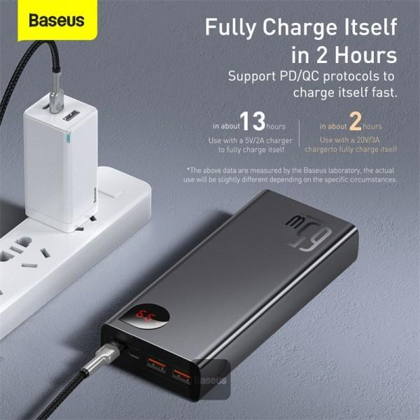 شارژر همراه باسئوس مدل PPIMDA-D03 ظرفیت 20000 میلی آمپر ساعت تنها 450 گرم وزن دارند و به راحتی قابل حمل است. این محصول دارای باتری پلیمری با ظرفیتی معادل 20 هزار میلی‌آمپر‌ساعت است و می‌تواند چندین‌بار (با توجه به ظرفیت باتری محصول مورد نظر) دستگاه شما را شارژ کند. این محصول دارای فناوری‌های محافظتی برای کنترل شدت جریان و ولتاژ است . بدنه این دستگاه بسیار مقاوم است و در اثر ضربه به ‌آسانی صدمه‌ای نمی‌بیند. قابل ذکر است که این پاوربانک توانی معادل 65 وات دارد و توانایی شارژ سریع کردن 3 دستگاه‌ را به‌صورت هم‌زمان دارد. شما برای شارژ پاوربانک باسئوس PPIMDA-D03 به 4 الی 6 ساعت زمان نیاز خواهید داشت.دو پورت خروجی USB روی این پاوربانک هر دو از استاندارد فست شارژ بهره می‌برند و می‌توانند گوشی شما را را با سرعت بالا شارژ کنند. پورت تایپ سی نیز از فناوری PD برخوردار شده و این یعنی قادر است دستگاه‌هایی غیر از گوشی موبایل که دارای توان برابر و کمتر از 65 وات هستند را هم شارژ کند. بدین ترتیب شما می‌توانید مک بوک‌تان را هم به این پاوربانک وصل کنید تا در عرض 2 ساعت شارژ شود.شما می‌توانید خود پاوربانک را هم با توان 20V/3A در عرض 4 ساعت شارژ کنید.به طور کلی پاوربانک فست شارژ 20000 میلی آمپر PPIMDA-D03 از فناوری‌های شارژ سریع QC ،PD و SCP پشتیبانی می‌کند.ابعاد این محصول 27×65×154 میلی متر می باشد.نحوه تقسیم توان شارژ میان پورتهای USB و تایپ سی در تصاویر موجود است و امکان شارژ 3 دستگاه همزمان وجود دارد.