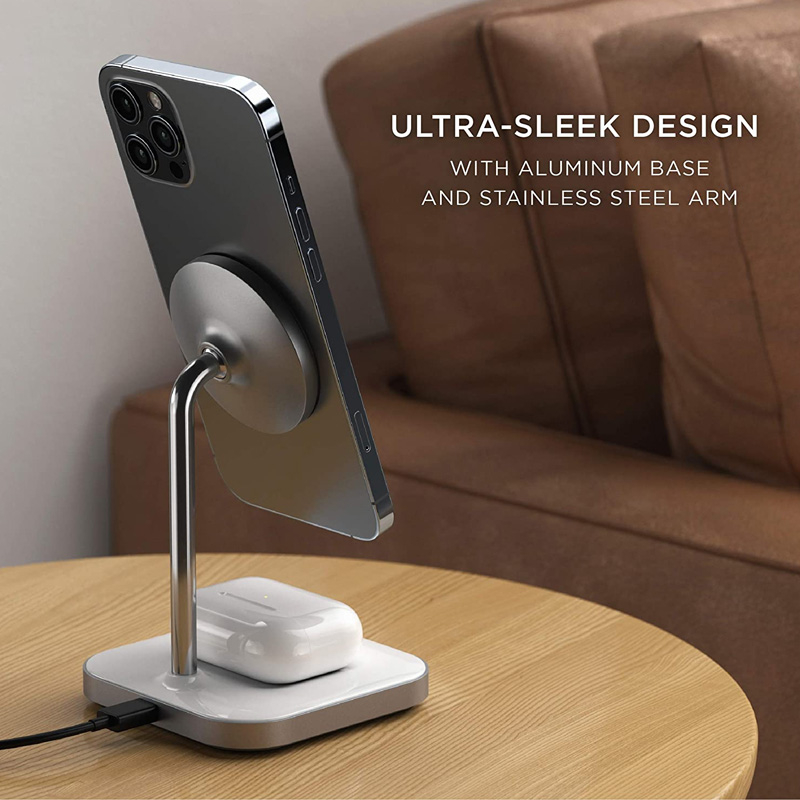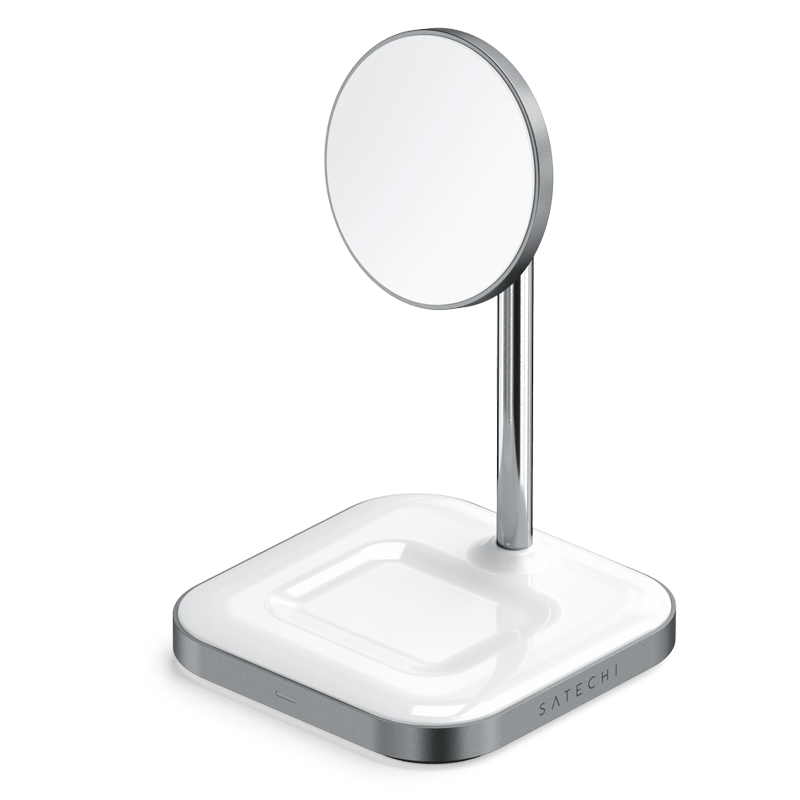 برند امریکایی ساتچی یک برند پریمیوم و رده بالا در زمینه تجهیزات جانبی محصولات اپل می باشد. کیفیت محصولات SATECHI و قدرت طراحی و تکنولوژی ساخت، به قدری بالاست که با محصولات اپل هم رده می باشد. محصول مینیمال MAGNETIC یک پایه شارژر 2 کاره ساتچی می باشد که همزمان با شارژ وایرلس آیفون 12، 13 و 14 ، ایرپاد اپل را نیز شارژ می نماید. قدرت شارژ آن ماکسیمم 15 وات بوده و همزمان با شارژ گوشی ، به علت طراحی فوق العاده و مگنت آن ، میتوان با گوشی نیز کار نمود. برای استفاده از این محصول، باید شارژر اپل خود را به پایه متصل کرده و برای اینکار از کابل TYPE-C موجود در جعبه استفاده نمایید. این پایه بدون گوشی نیز بسیار زیبا بوده و طراحی و متریال استیل و آلومینیوم آن چشم نواز می باشد. اگر شما یک طراح، تولید کننده محتوا و یا تریدر هستید و یا نظم و زیبایی میز شما برای شما مهم است، این محصول بهترین انتخاب می باشد.